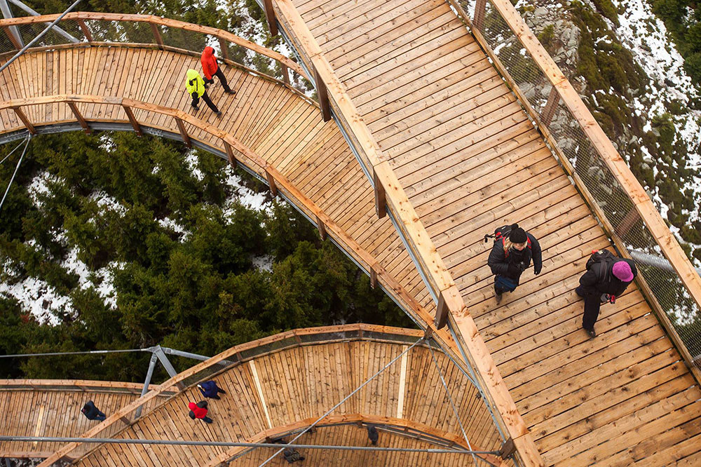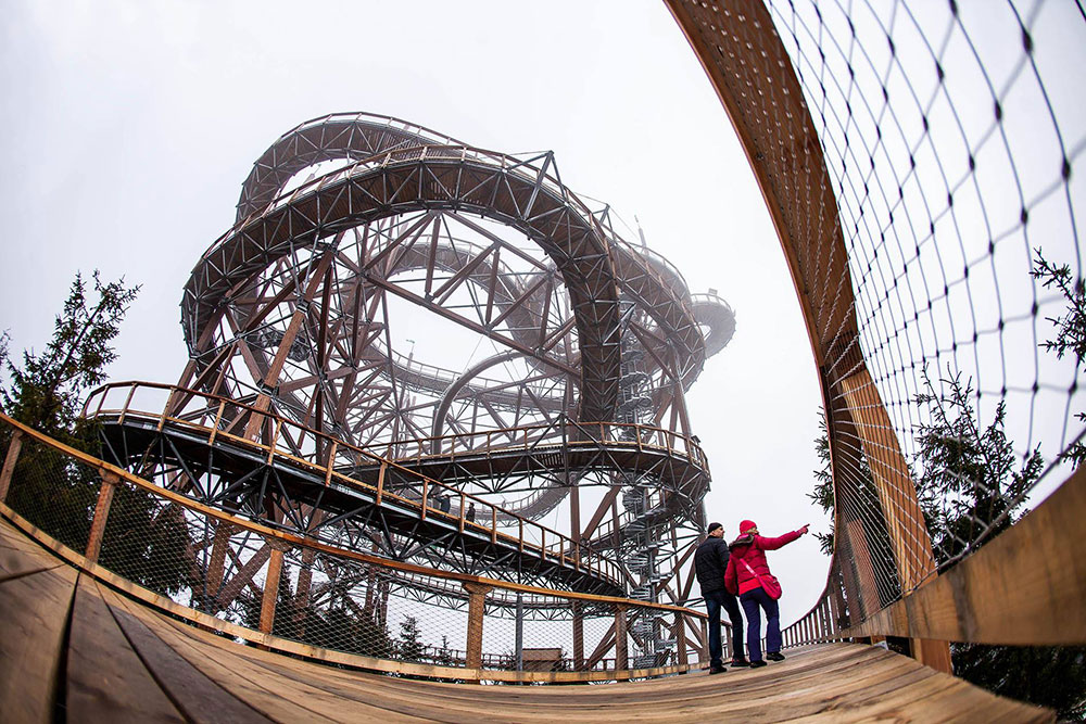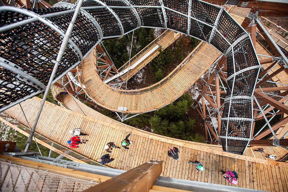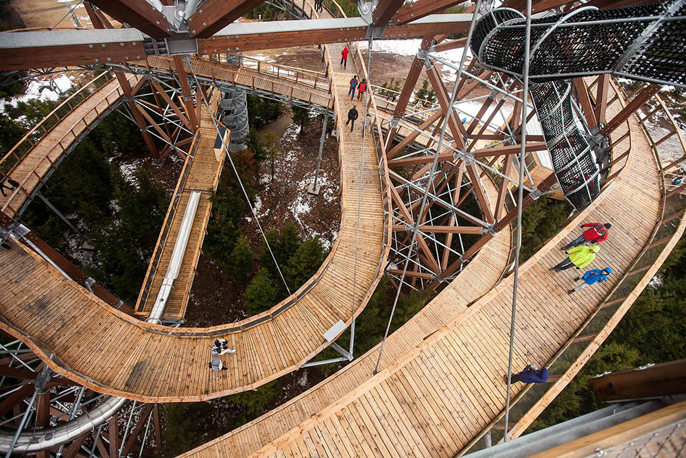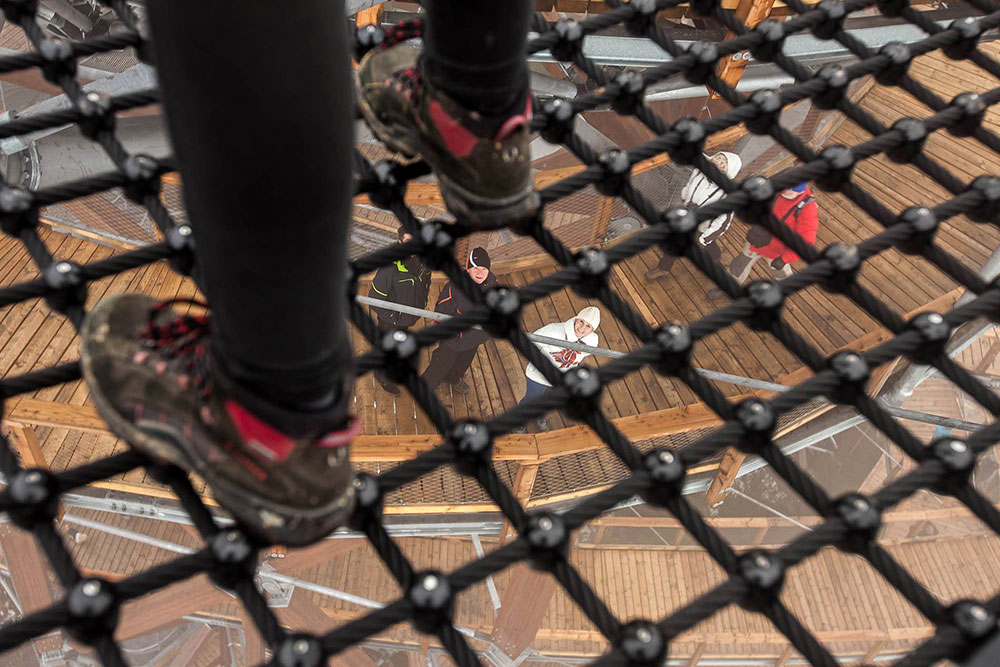 Tutaj niebo jest na wyciągnięcie ręki, poszerzamy własne horyzonty - poczucie wysokości i przestrzeni, które do tej pory było nam obce, staje się dostępne, a przy tym bezpieczne. Na wysokość zarezerwowaną dla szybujących ptaków dostaniemy się pieszo, bez najmniejszego ryzyka, po szerokiej i łagodnej kładce przystosowanej także dla rodziców z wózkami, a także osób niepełnosprawnych. Wzdłuż ścieżki zamontowano liczne tabliczki informacyjne, które przedstawiają historię regionu oraz opisują bliższe i dalsze krajobrazy. Po zdobyciu najwyższego piętra mamy dwie możliwości, powrót tą samą drewnianą ścieżką lub użycie bezpiecznie wyprofilowanej zjeżdżalni o długości 101 m, którą w szybkim czasie dostaniemy się na najniższe piętro konstrukcji - emocje podczas zjazdu gwarantowane! Dodatkowe atrakcje to tunele między piętrami oraz „gniazda” z sieci na wysuniętych tarasach.