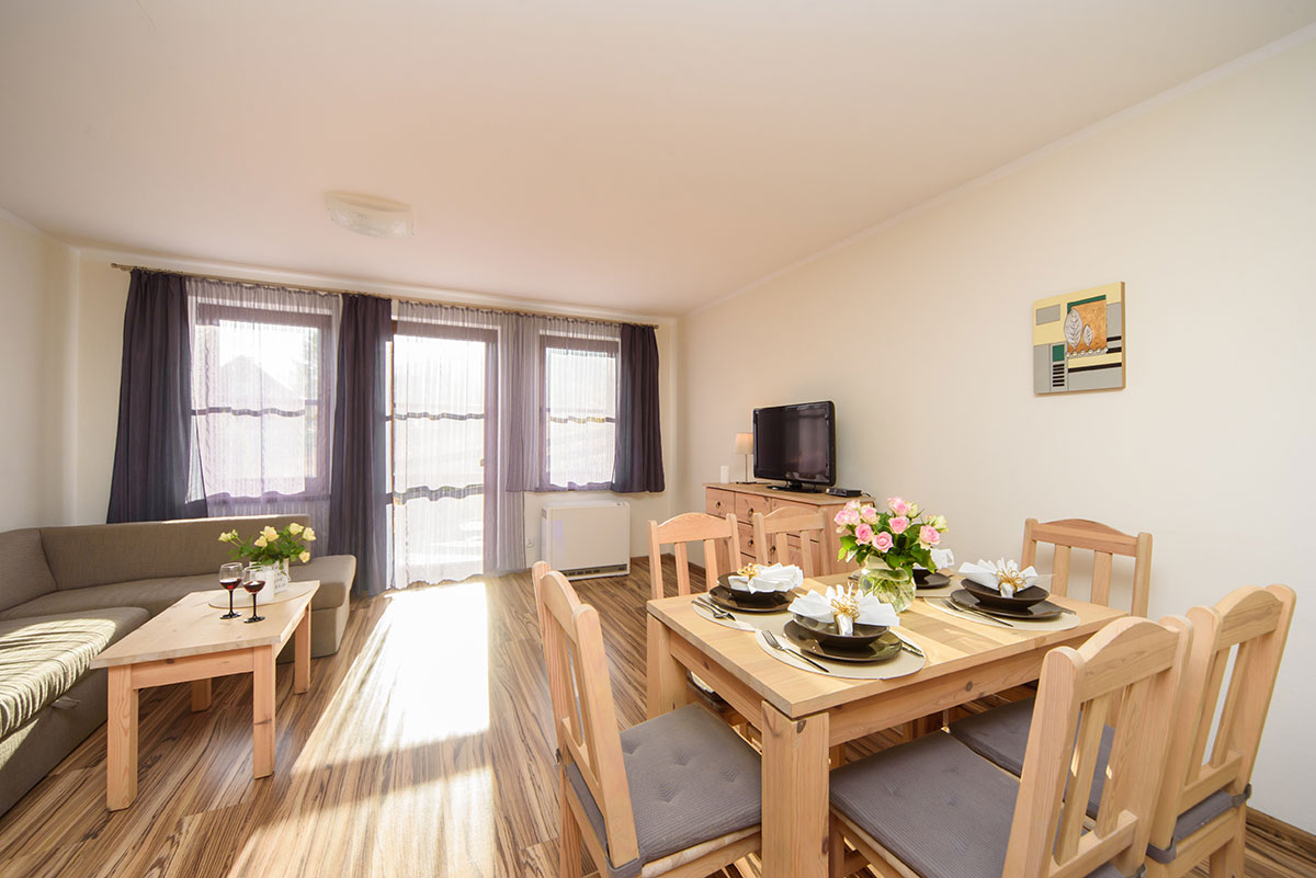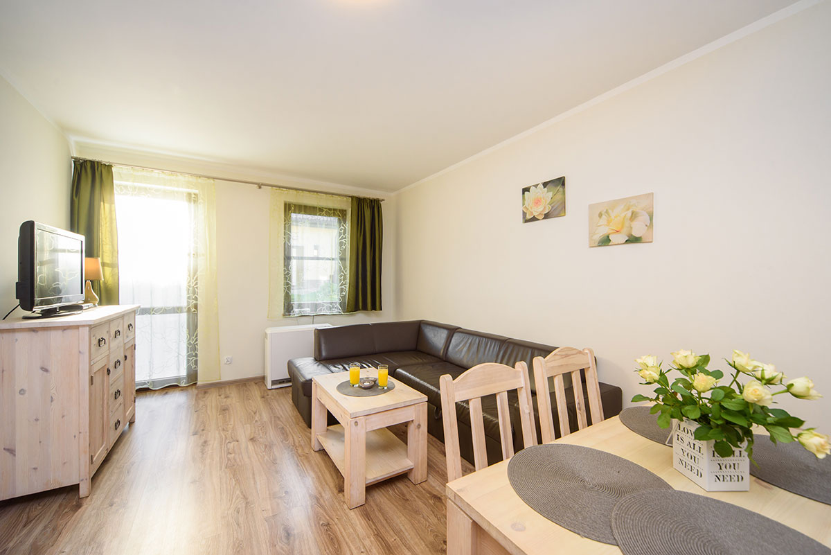 Samodzielne całoroczne apartamenty do wynajęcia, pokoje hotelowe, restauracja, sala konferencyjna.