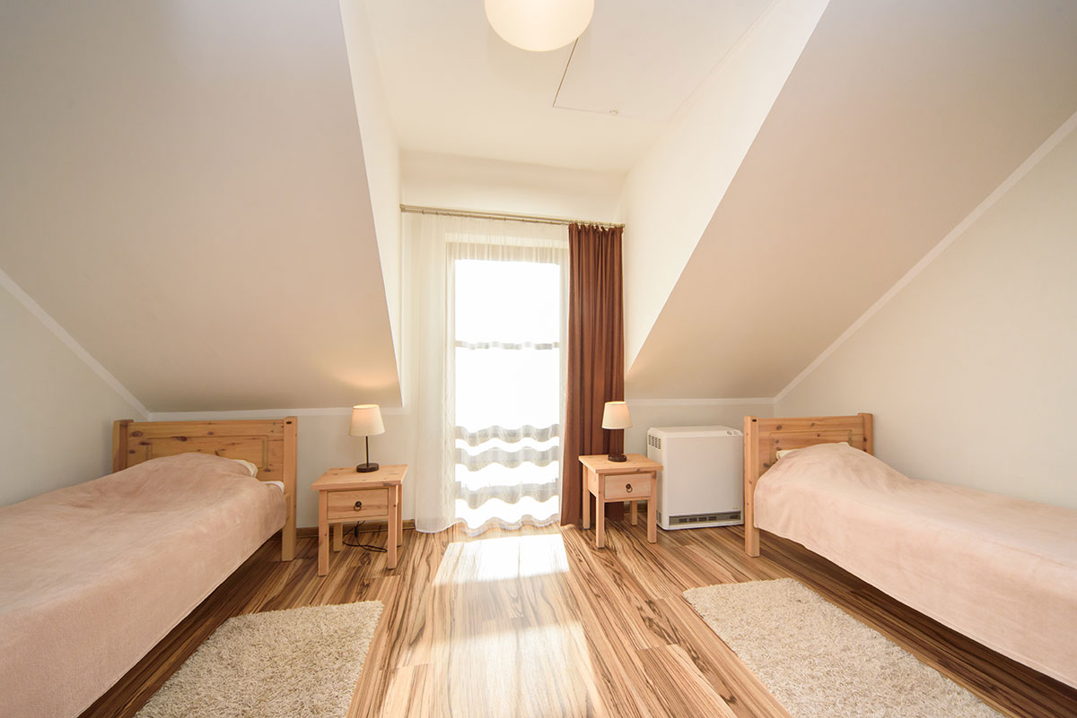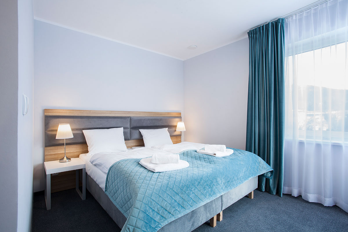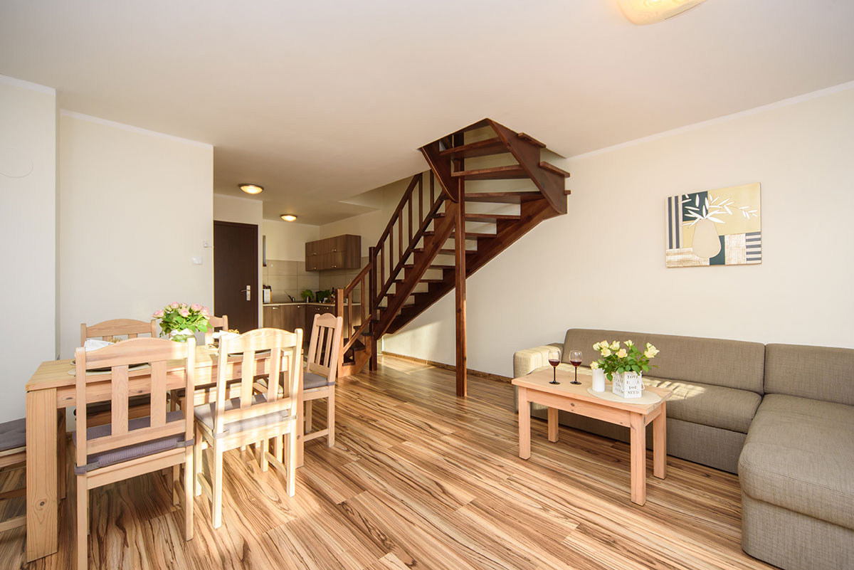 Posiadamy 8 apartamentów jednopoziomowych, czteroosobowych oraz 11 apartamentów dwupoziomowych, sześcioosobowych (w tym 4 z możliwością dostawki), 16 dwuosobowych pokoi hotelowych.