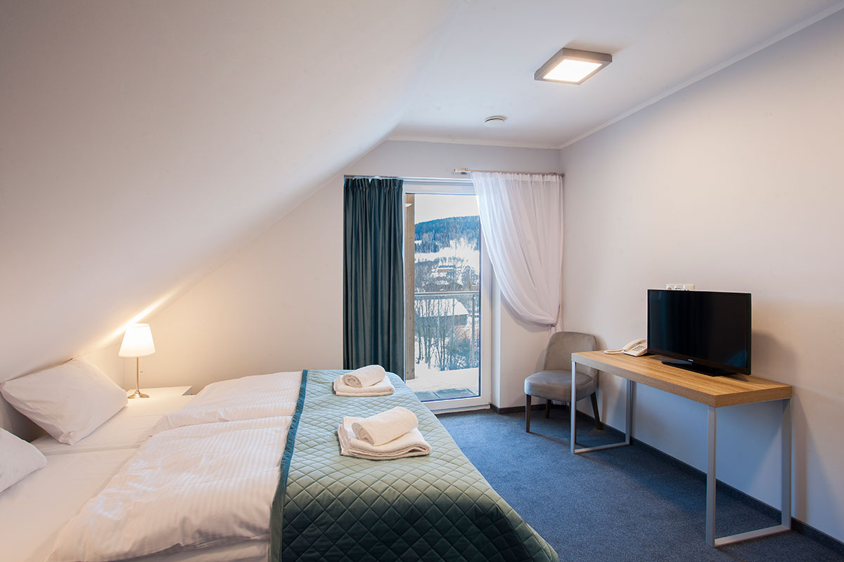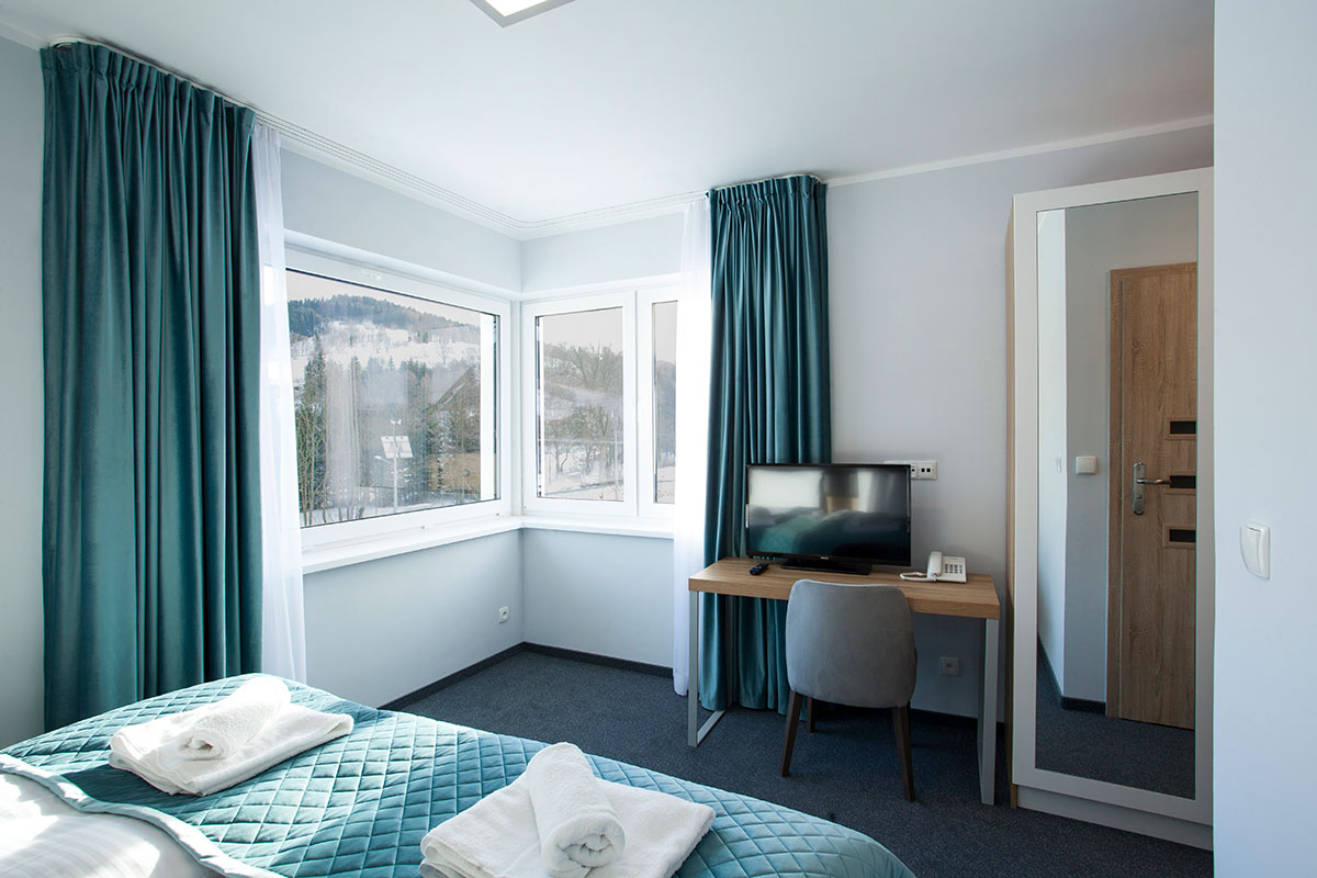 16 dwuosobowych pokoi hotelowych. Przy każdym pokoju jest łazienka z kabiną prysznicową, telefon, WIFI, oraz telewizor LCD.