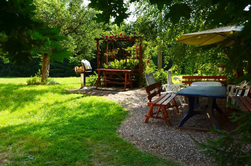 Przy domu jest miejsce na samochód, pergola, grill, zielona łąka.