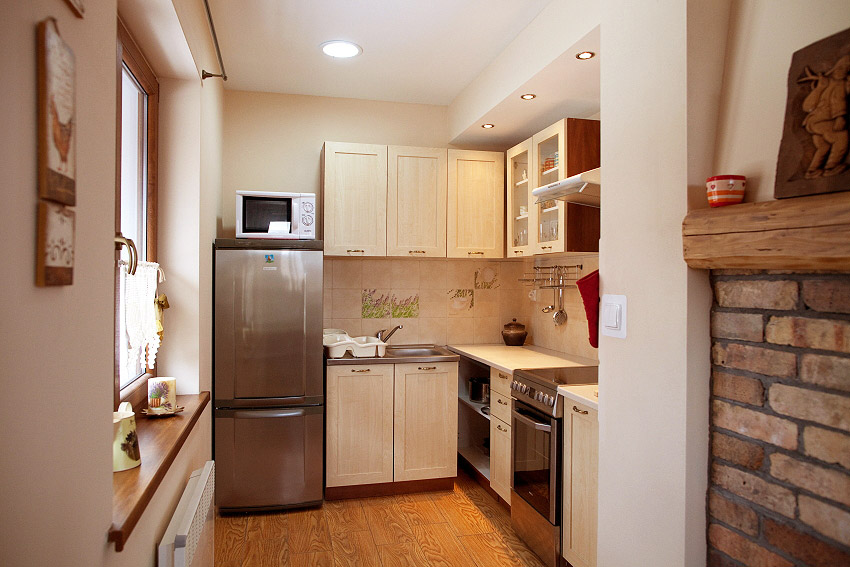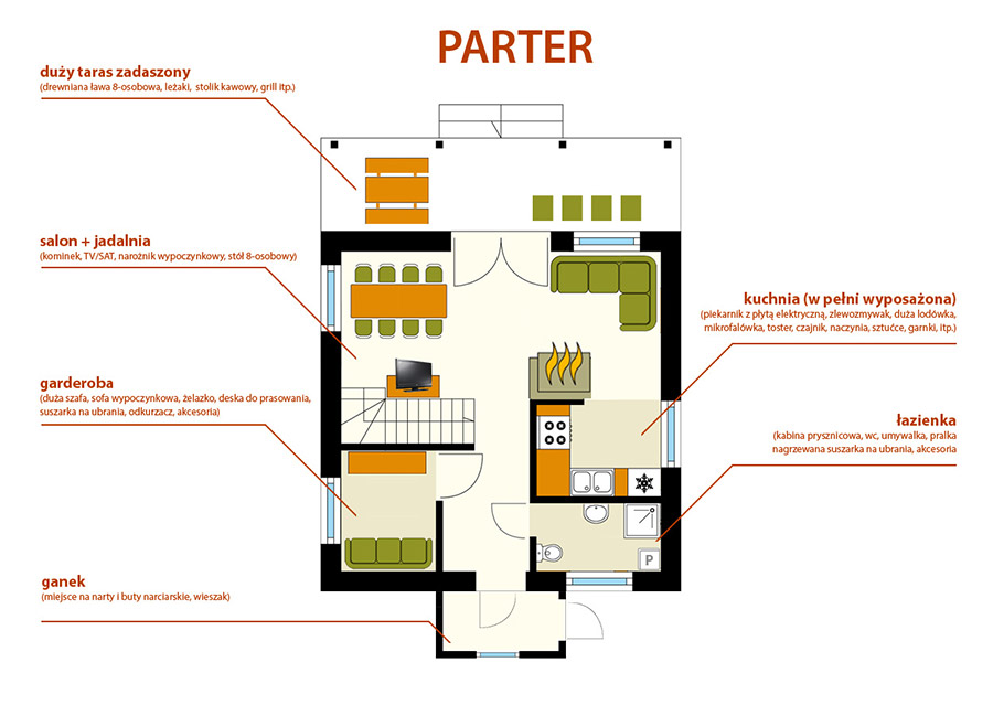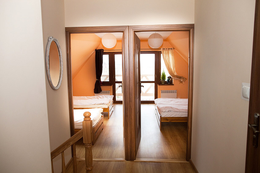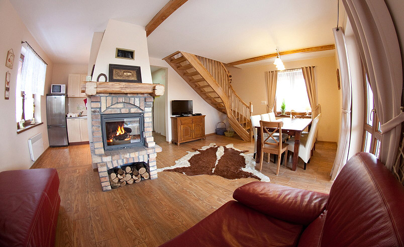 Domek ma 100 m2 i może pomieścić maksymalnie 8 osób. Wszystkie pomieszczenia urządzone są gustownie, z dbałością o szczegóły. Połączenie nowoczesnego wyposażenia z tradycyjnym wykończeniem, jakim jest drewno, nadaje całości przytulny klimat.