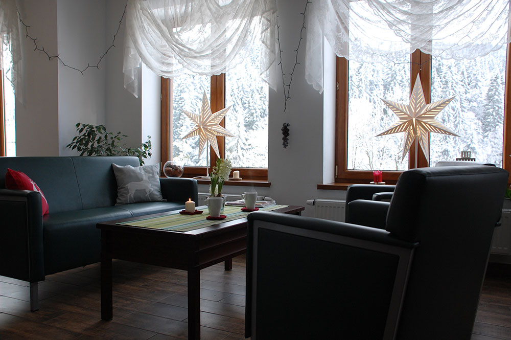 Do dyspozycji naszych Gości w WILLI RUDY przygotowaliśmy dużą przestrzeń wspólną – salę jadalnię z telewizją. W okresie zimowym, a także przy grupach zorganizowanych serwujemy tutaj śniadania w formie szwedzkiego stołu. Wieczorami można tutaj wspólnie spędzić czas z rodziną i znajomymi, pograć w gry planszowe czy poczytać książkę.