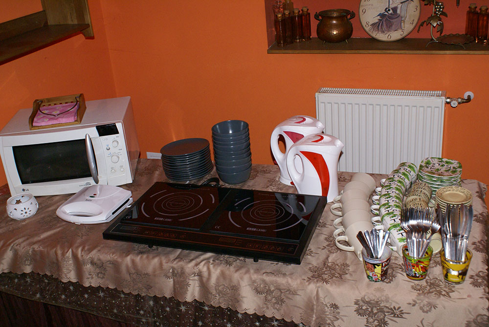 Jadalnia wyposażona jest w kompletną zastawę kuchenną do przygotowania i spożywania posiłków, lodówki, kuchenki elektryczne, mikrofalówki, czajniki elektryczne, toster do kanapek. Poza tym każdy apartament wyposażony jest w zestaw do parzenia kawy i herbaty.