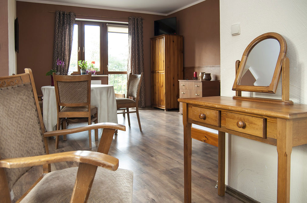 Każdy pokój posiada własną łazienkę i telewizor. Do dyspozycji gości jest aneks kuchenny (mikrofala, czajnik). Na terenie obiektu udostępniony jest nieodpłatnie internet w technologii bezprzewodowej.